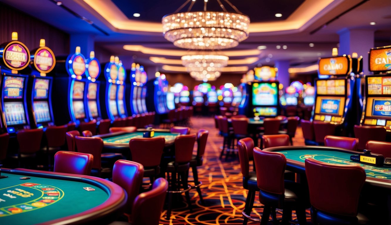 Sebuah kasino online yang ramai dengan meja permainan berwarna-warni dan mesin slot. Lampu neon yang bersinar dan suasana yang hidup
